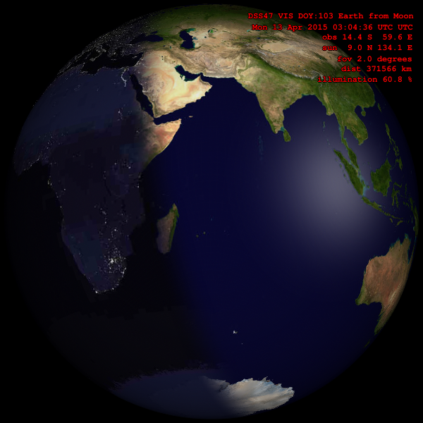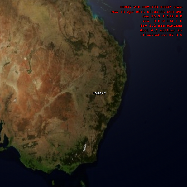 DSS47 is the NASA Deep Space Network (DSN) name of the Australia Telescope Compact Array in Narrabri. On these pages, NASA tracking specialists (and other enthusiasts) can find visualizations and information on their current spacecraft tracks. The programs Dr Balthasar Indermuehle developed for these animations and information screens make extensive use of Hari Nair's excellent solar system simulator xplanet for the visualisation, and use NASA/JPL's SPICE library to calculate the positions of the satellites.