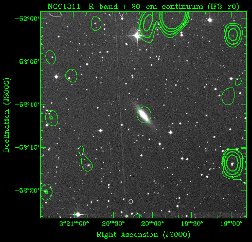 NGC1311 (HIPASS J0320-52) is a barred spiral galaxy (Type = SB(s)m,